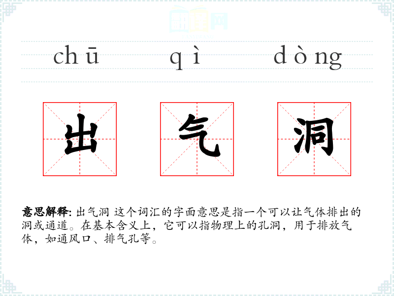 出气洞 这个词汇的字面意思是指一个可以让气体排出的洞或通道。在基本含义上,它可以指物理上的孔洞,用于排放气体,如通风口、排气孔等。
