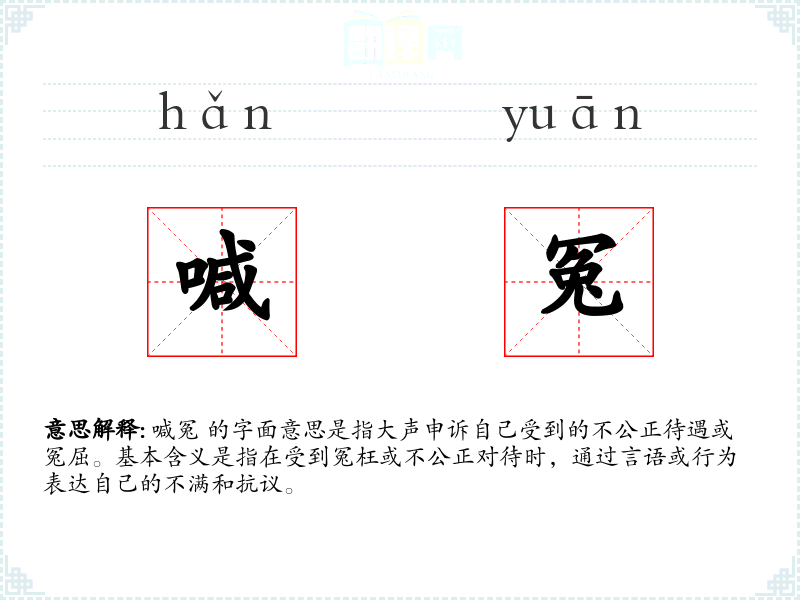 喊冤 的字面意思是指大声申诉自己受到的不公正待遇或冤屈。基本含义是指在受到冤枉或不公正对待时,通过言语或行为表达自己的不满和抗议。