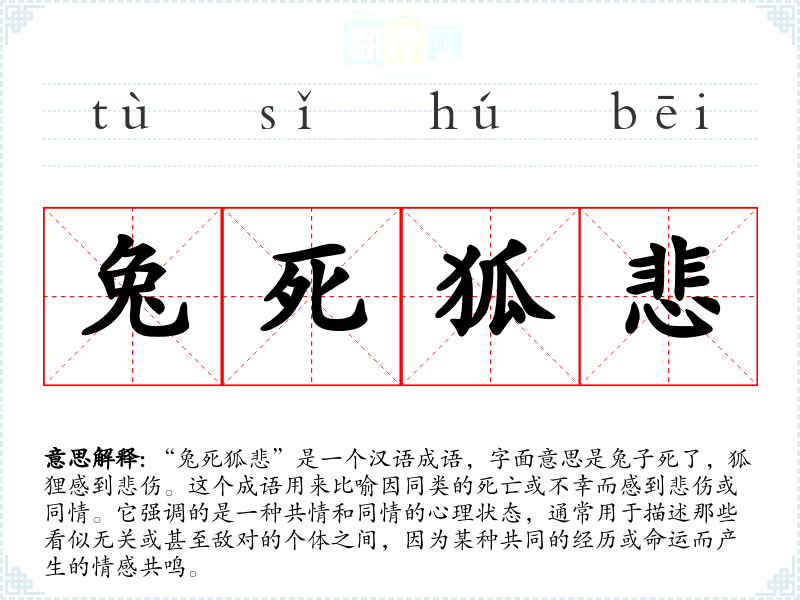 “兔死狐悲”是一个汉语成语,字面意思是兔子死了,狐狸感到悲伤。这个成语用来比喻因同类的死亡或不幸而感到悲伤或同情。它强调的是一种共情和同情的心理状态,通常用于描述那些看似无关或甚至敌对的个体之间,因为某种共同的经历或命运而产生的情感共鸣。
