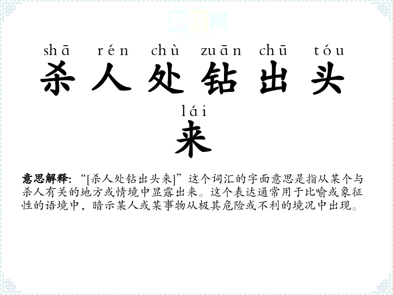 “[杀人处钻出头来]”这个词汇的字面意思是指从某个与杀人有关的地方或情境中显露出来。这个表达通常用于比喻或象征性的语境中,暗示某人或某事物从极其危险或不利的境况中出现。