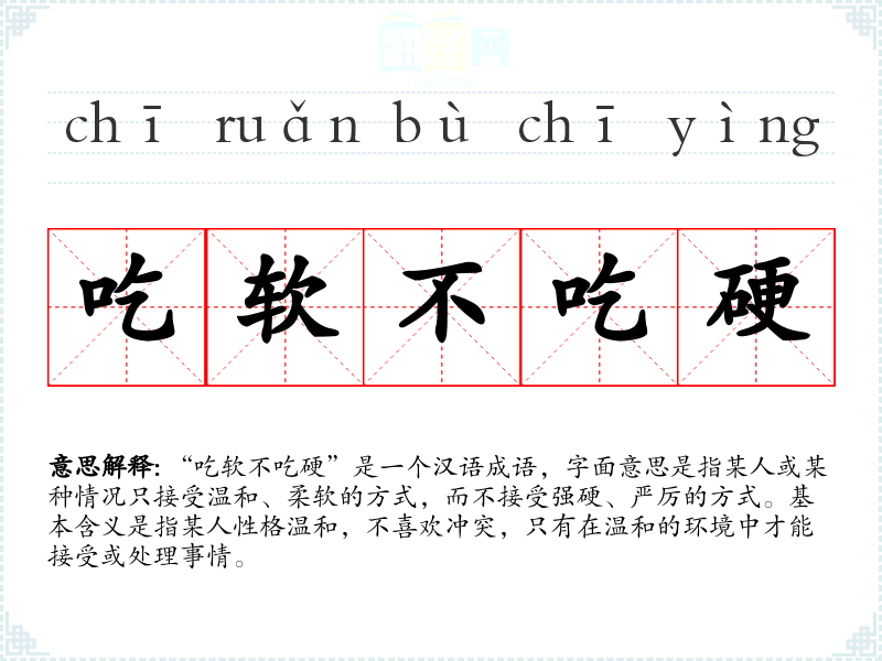 “吃软不吃硬”是一个汉语成语,字面意思是指某人或某种情况只接受温和、柔软的方式,而不接受强硬、严厉的方式。基本含义是指某人性格温和,不喜欢冲突,只有在温和的环境中才能接受或处理事情。