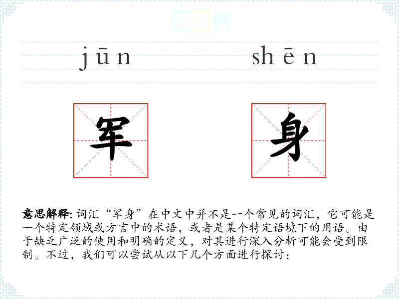 由于“军身”不是一个标准词汇,我们无法给出一个确切的字面意思和基本含义。它可能是指军人的身体,或者与军事相关的某种身体状态或条件。