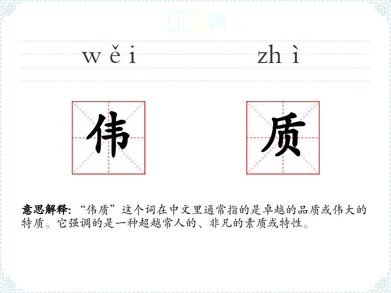 “伟质”这个词在中文里通常指的是卓越的品质或伟大的特质。它强调的是一种超越常人的、非凡的素质或特性。