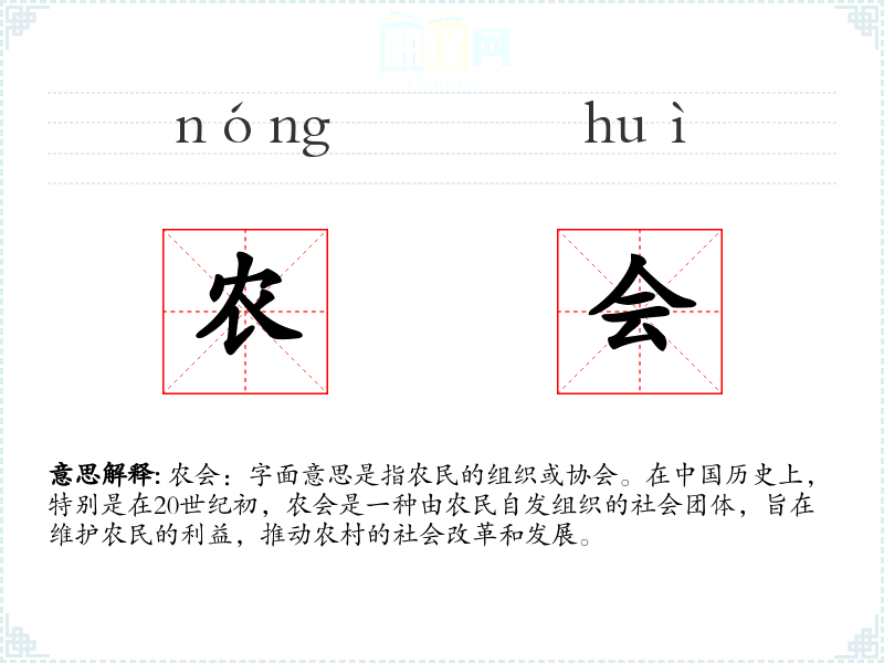 农会:字面意思是指农民的组织或协会。在**历史上,特别是在20世纪初,农会是一种由农民自发组织的社会团体,旨在维护农民的利益,推动农村的社会改革和发展。