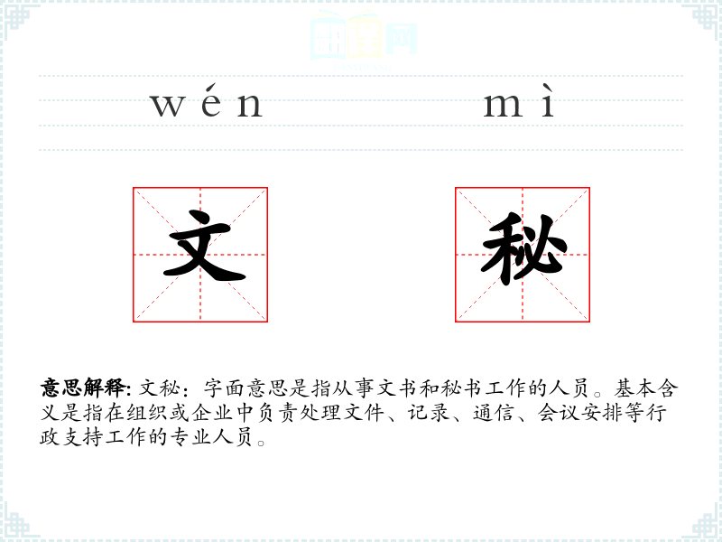 文秘:字面意思是指从事文书和秘书工作的人员。基本含义是指在组织或企业中负责处理文件、记录、通信、会议安排等行政支持工作的专业人员。