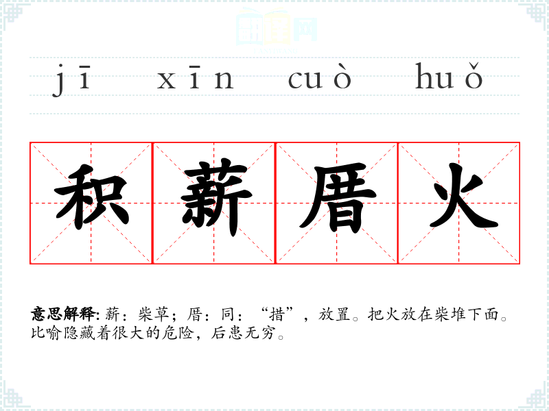 薪:柴草;厝:同:“措”,放置。把火放在柴堆下面。比喻隐藏着很大的危险,