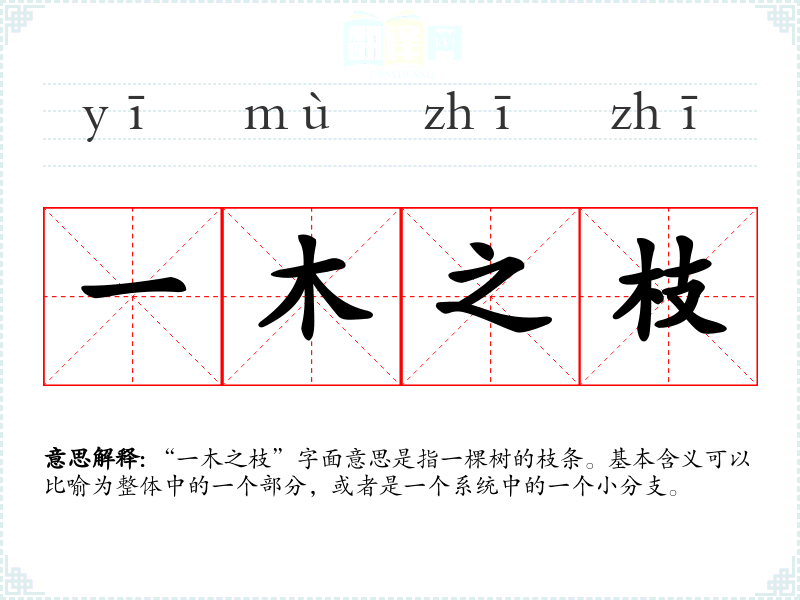 “一木之枝”字面意思是指一棵树的枝条。基本含义可以比喻为整体中的一个部分,或者是一个系统中的一个小分支。