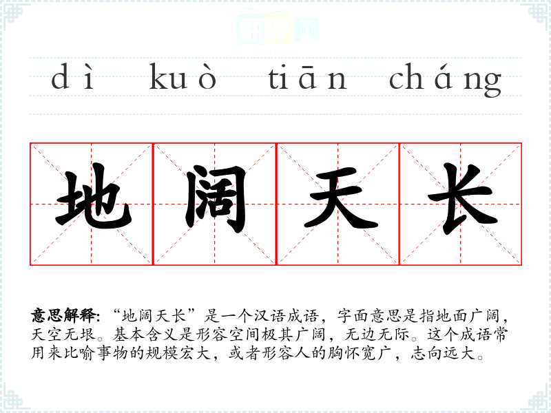 “地阔天长”这个成语的词源较为古老,源自**古代对自然景观的描绘。随着时间的推移,这个成语的含义和用法逐渐固定下来,成为描述广阔空间的常用词汇。
