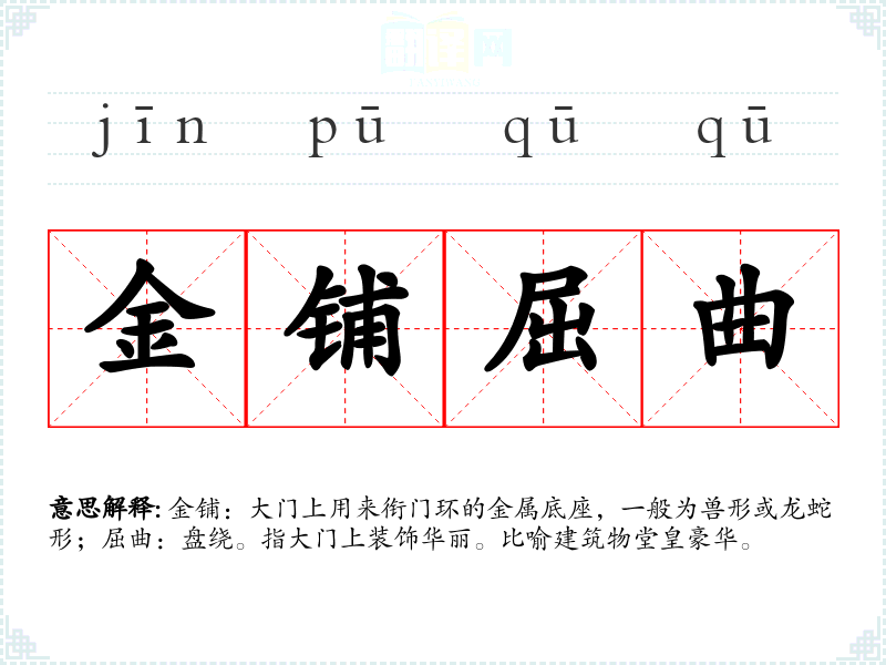 金铺:大门上用来衔门环的金属底座,一般为兽形或龙蛇形;屈曲:盘绕。指大门上装饰华丽。比喻建筑物堂皇豪华。