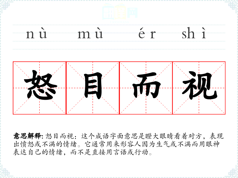 在文化中,眼神交流是一种重要的非言语沟通方式。因此,“怒目而视”不仅仅是一个描述性的成语,它还反映了人对于眼神交流的重视和理解。