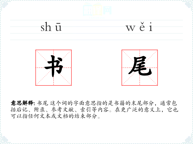 书尾 这个词的字面意思指的是书籍的末尾部分,通常包括后记、附录、参考文献、索引等内容。在更广泛的意义上,它也可以指任何文本或文档的结束部分。