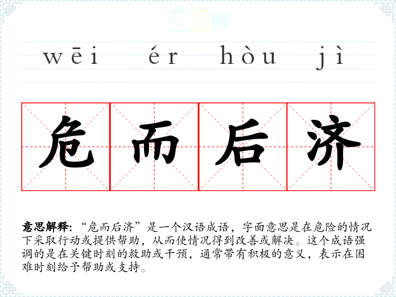 “危而后济”是一个汉语成语,字面意思是在危险的情况下采取行动或提供帮助,从而使情况得到改善或解决。这个成语强调的是在关键时刻的救助或干预,通常带有积极的意义,表示在困难时刻给予帮助或支持。