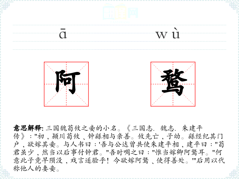 1.三国魏荀攸之妾的小名。《三国志.魏志.朱建平传》﹕"初﹐颍川荀攸﹑钟繇相与亲善。攸先亡﹐子幼。繇经纪其门户﹐欲嫁其妾。与人书曰﹕'吾与公达曾共使朱建平相﹐建平曰﹕"荀君虽少﹐然当以后事付钟君。"吾时啁之曰﹕"惟当嫁卿阿鹜耳。"何意此子竟早陨没﹐戏言遂验乎!今欲嫁阿鹜﹑使得善处。'"后用以代称他人的妻妾。