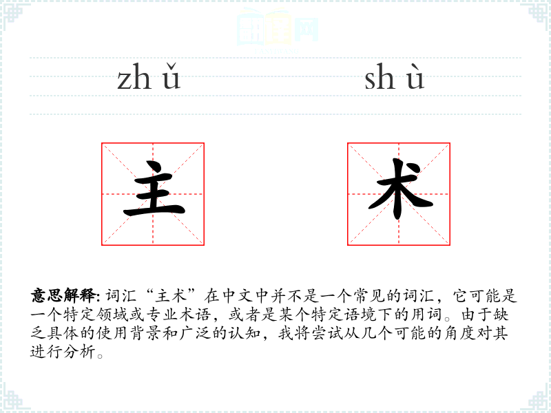 由于“主术”不是一个常见词汇,对其的理解和应用存在很大的不确定性。在语言学习和表达中,了解词汇的具体使用背景和语境是非常重要的。如果“主术”是一个特定领域或语境下的词汇,深入了解该领域或语境将有助于更好地理解和使用该词汇。