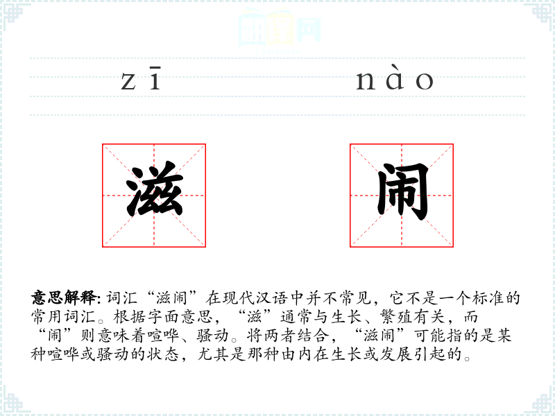 词汇“滋闹”在现代汉语中并不常见,它不是一个标准的常用词汇。根据字面意思,“滋”通常与生长、繁殖有关,而“闹”则意味着喧哗、骚动。将两者结合,“滋闹”可能指的是某种喧哗或骚动的状态,尤其是那种由内在生长或发展引起的。