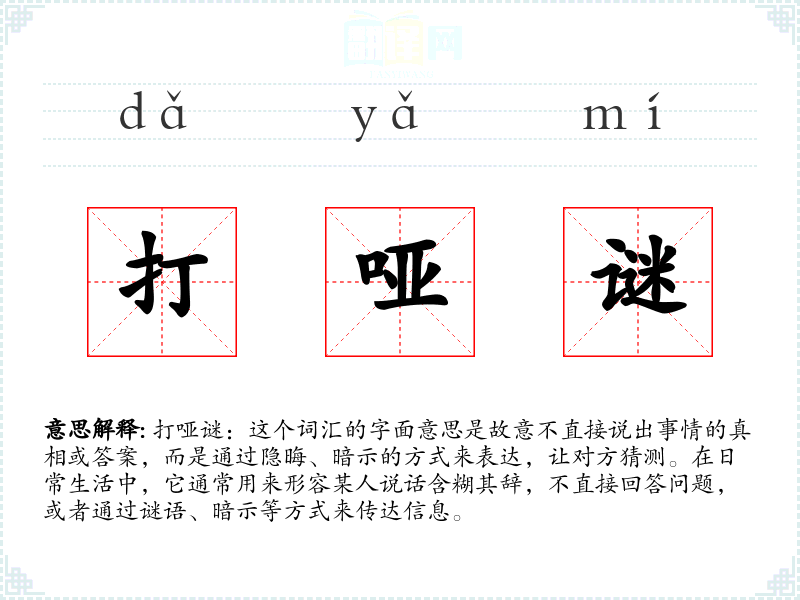 打哑谜:这个词汇的字面意思是故意不直接说出事情的真相或答案,而是通过隐晦、暗示的方式来表达,让对方猜测。在日常生活中,它通常用来形容某人说话含糊其辞,不直接回答问题,或者通过谜语、暗示等方式来传达信息。