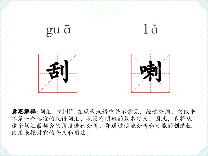 由于“刮喇”不是一个标准词汇,我们无法给出一个确切的基本定义。它可能是方言词汇,或者是某个特定社群中的俚语。