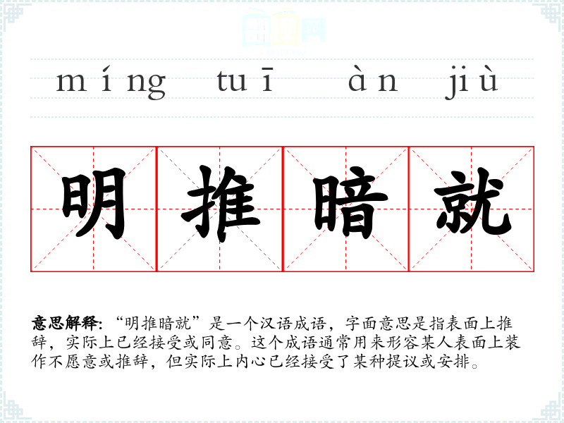 “明推暗就”是一个汉语成语,字面意思是指表面上推辞,实际上已经接受或同意。这个成语通常用来形容某人表面上装作不愿意或推辞,但实际上内心已经接受了某种提议或安排。