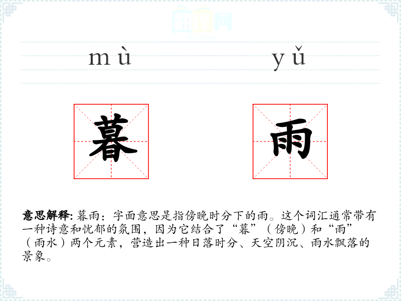 文学语境:在文学作品中,“暮雨”常用来描绘一种凄凉、孤寂或深沉的氛围,如“暮雨潇潇,打湿了窗外的梧桐”。