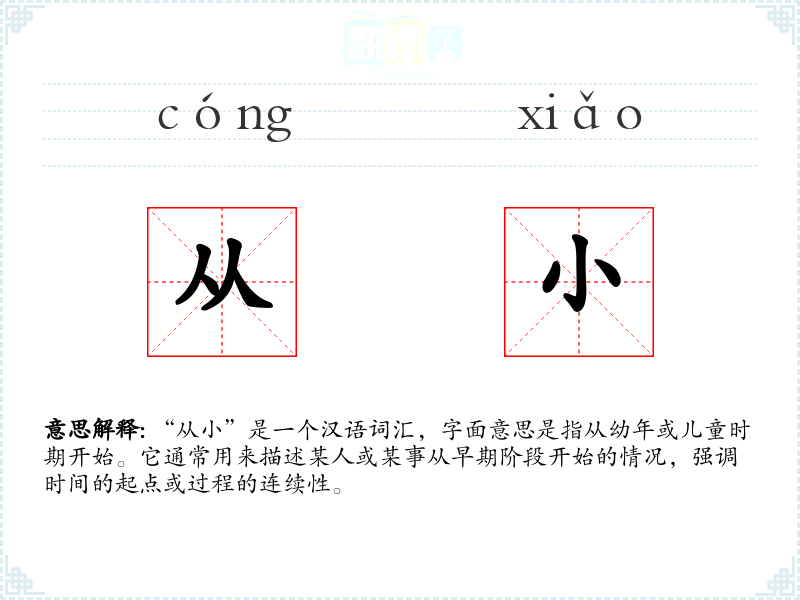 “从小”这个词汇在汉语中历史悠久,其结构简单,由“从”和“小”两个字组成,没有复杂的词源故事。在古代文献中已有使用,如《诗经》中就有“从小”的用法,其含义和现代基本一致。