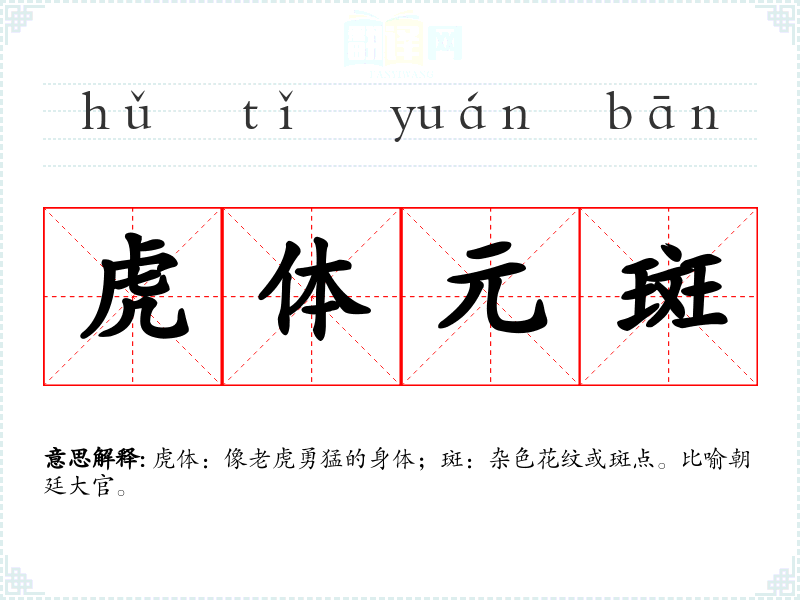 虎体:像老虎勇猛的身体;斑:杂色花纹或斑点。比喻朝廷大官。