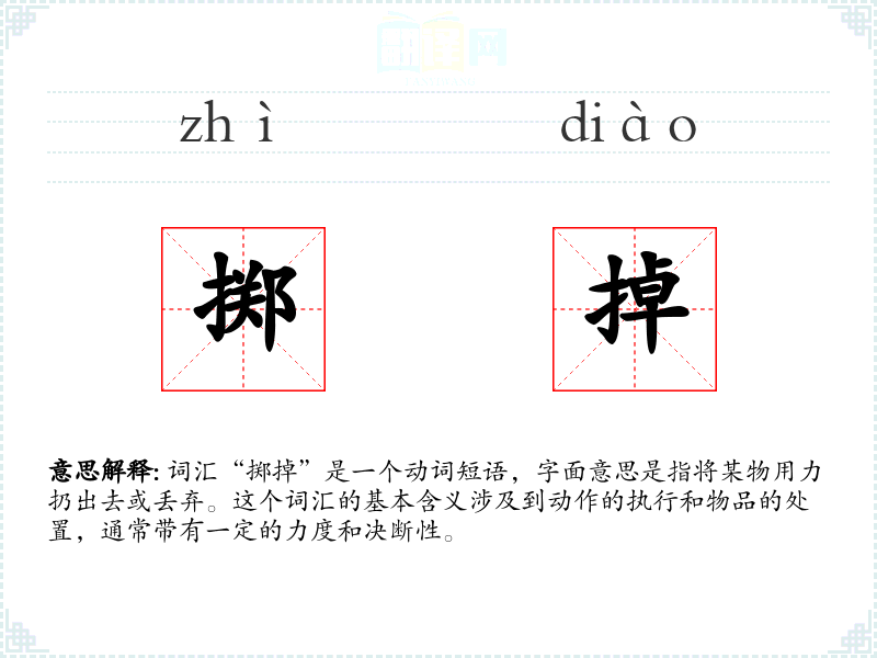 词汇“掷掉”是一个动词短语,字面意思是指将某物用力扔出去或丢弃。这个词汇的基本含义涉及到动作的执行和物品的处置,通常带有一定的力度和决断性。