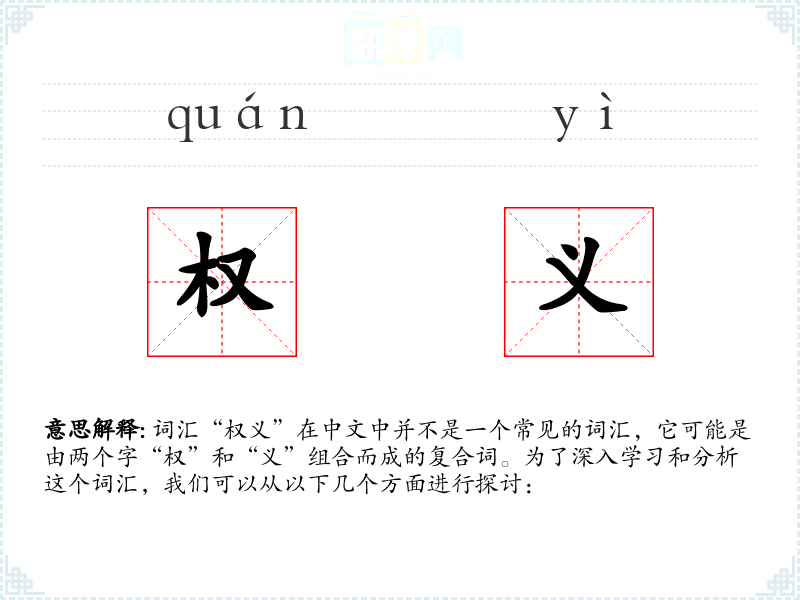词汇“权义”在中文中并不是一个常见的词汇,它可能是由两个字“权”和“义”组合而成的复合词。为了深入学*和分析这个词汇,我们可以从以下几个方面进行探讨: