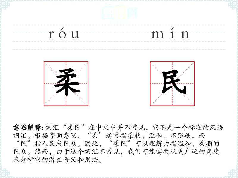 由于“柔民”不是一个常用词汇,它在不同的语境中可能会有不同的解释。在文学作品中,它可能用来描绘一个民族或群体的温和性格;在政治或社会学讨论中,它可能指代那些不积极参与政治活动、顺从权威的民众。