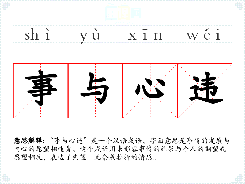 “事与心违”是一个汉语成语,字面意思是事情的发展与内心的愿望相违背。这个成语用来形容事情的结果与个人的期望或愿望相反,表达了失望、无奈或挫折的情感。