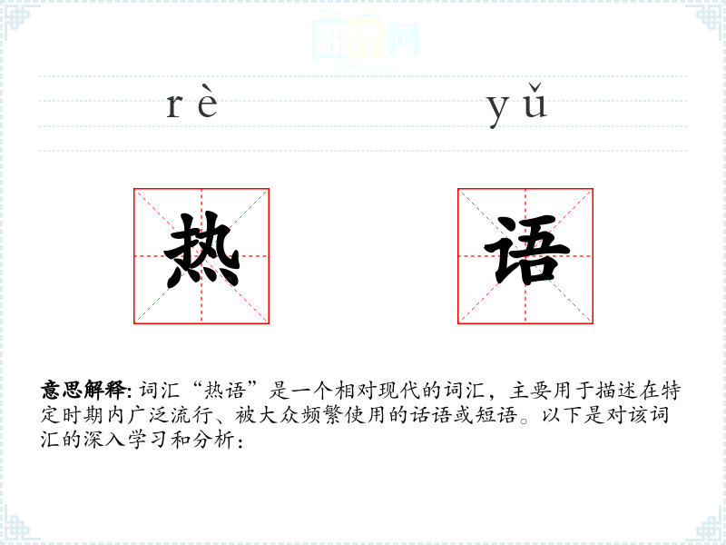 词汇“热语”是一个相对现代的词汇,主要用于描述在特定时期内广泛流行、被大众频繁使用的话语或短语。以下是对该词汇的深入学*和分析: