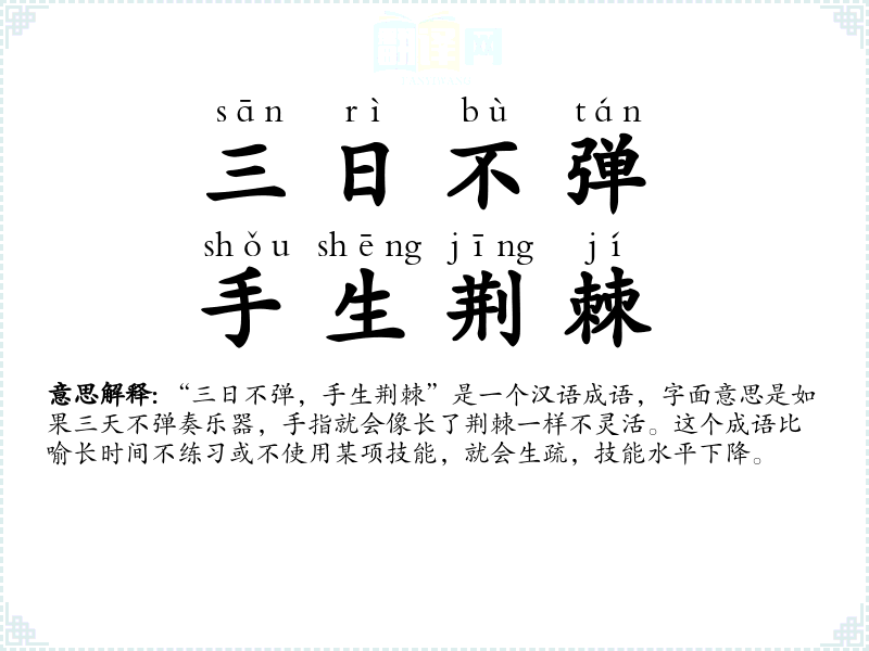 “三日不弹,手生荆棘”是一个汉语成语,字面意思是如果三天不弹奏乐器,手指就会像长了荆棘一样不灵活。这个成语比喻长时间不练*或不使用某项技能,就会生疏,技能水平下降。
