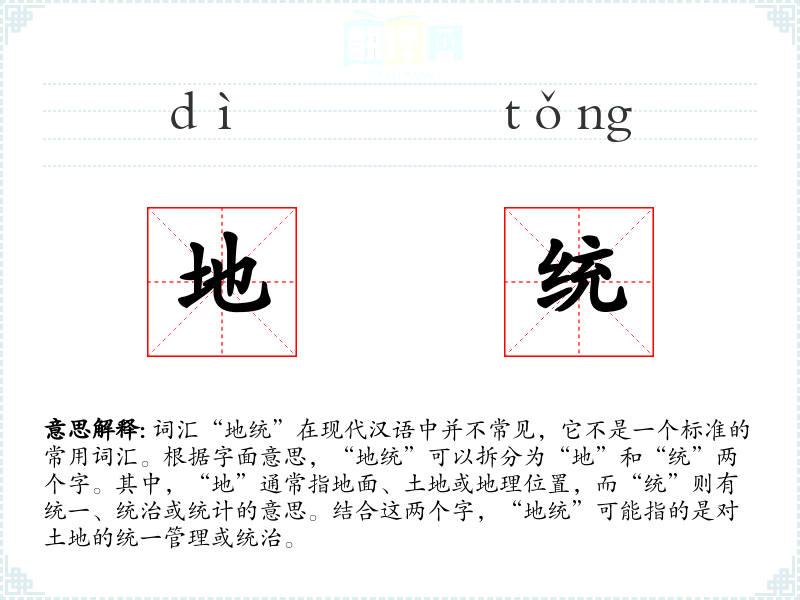 在古代中国,土地是国家的重要资源,因此“地统”可能与当时的土地管理制度和社会结构有关。在现代社会,这个词汇已经不再常用,相关的概念被更具体的词汇所替代。