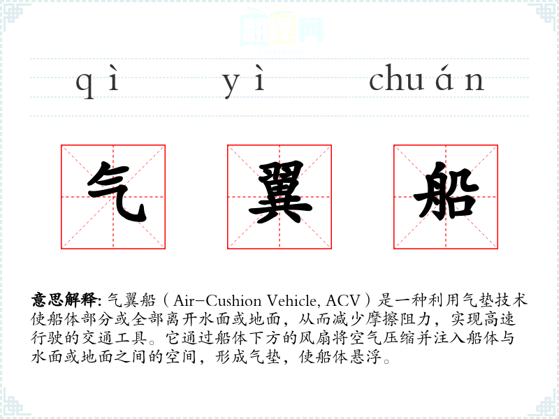在不同语言中,气翼船可能有不同的名称,但其基本概念和技术原理是相似的。例如,在英语中,气翼船被称为“Air-Cushion Vehicle”。