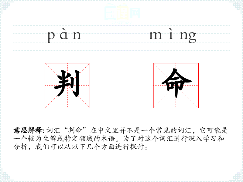 词汇“判命”在中文里并不是一个常见的词汇,它可能是一个较为生僻或特定领域的术语。为了对这个词汇进行深入学习和分析,我们可以从以下几个方面进行探讨: