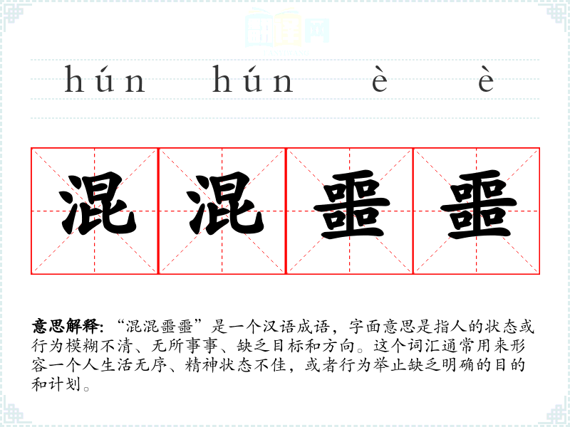 “混混噩噩”是一个汉语成语,字面意思是指人的状态或行为模糊不清、无所事事、缺乏目标和方向。这个词汇通常用来形容一个人生活无序、精神状态不佳,或者行为举止缺乏明确的目的和计划。