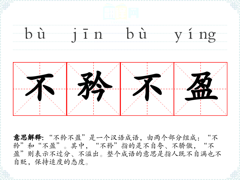 “不矜不盈”是一个汉语成语,由两个部分组成:“不矜”和“不盈”。其中,“不矜”指的是不自夸、不骄傲,“不盈”则表示不过分、不溢出。整个成语的意思是指人既不自满也不自贬,保持适度的态度。