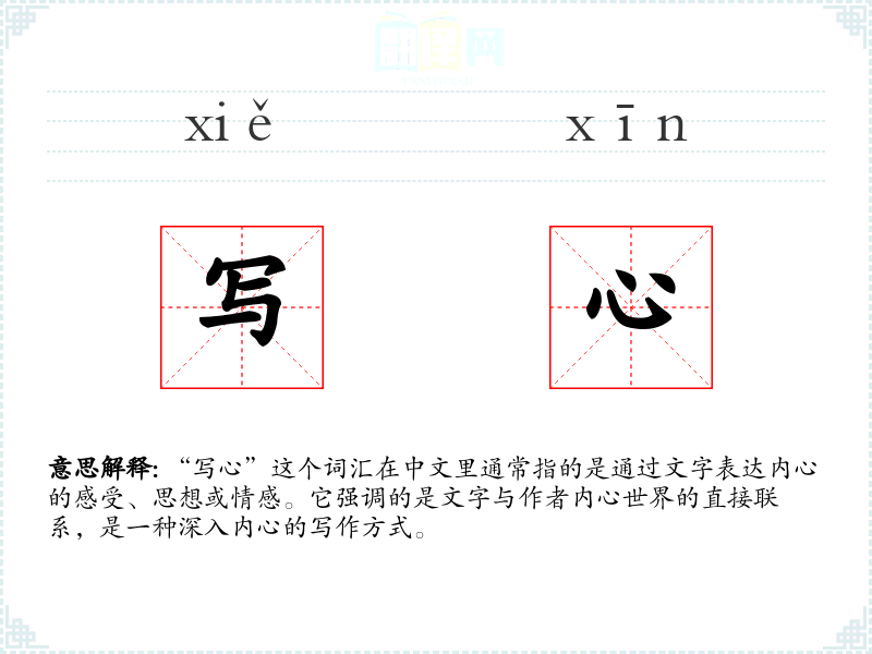 在英语中,“写心”可以对应为“writing from the heart”或“expressing one's inner feelings”。这些表达方式虽然在字面上略有不同,但都强调了通过文字表达内心世界的概念。