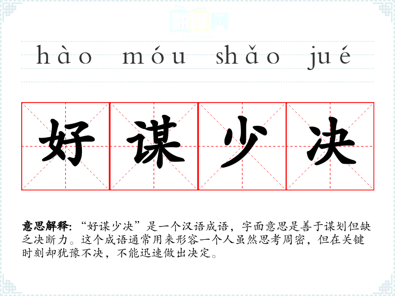 “好谋少决”是一个汉语成语,字面意思是善于谋划但缺乏决断力。这个成语通常用来形容一个人虽然思考周密,但在关键时刻却犹豫不决,不能迅速做出决定。