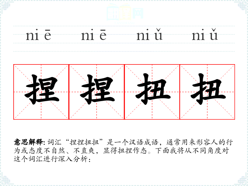 词汇“捏捏扭扭”是一个汉语成语,通常用来形容人的行为或态度不自然、不直爽,显得扭捏作态。下面我将从不同角度对这个词汇进行深入分析: