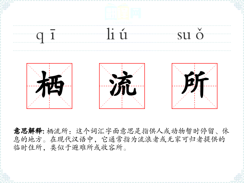 栖流所:这个词汇字面意思是指供人或动物暂时停留、休息的地方。在现代汉语中,它通常指为流浪者或无家可归者提供的临时住所,类似于避难所或收容所。