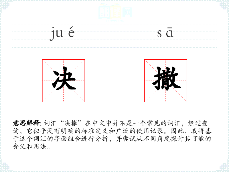 “决撒”可能是由“决”和“撒”两个字组合而成的词汇。其中,“决”通常表示决定、解决或坚决等含义,而“撒”则可能表示散布、放开或撒谎等含义。结合这两个字,我们可以推测“决撒”可能意味着“坚决地散布或放开”某事物。