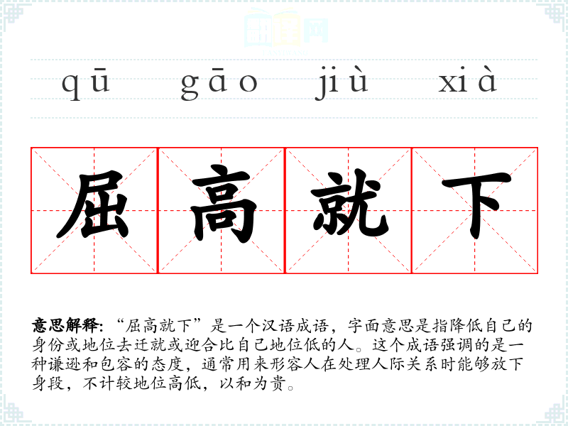 “屈高就下”是一个汉语成语,字面意思是指降低自己的身份或地位去迁就或迎合比自己地位低的人。这个成语强调的是一种谦逊和包容的态度,通常用来形容人在处理人际关系时能够放下身段,不计较地位高低,以和为贵。