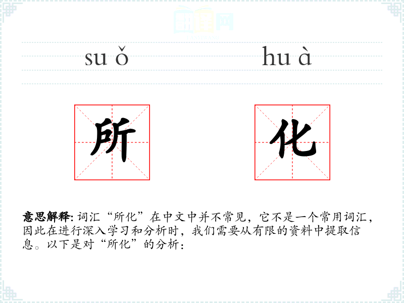 “所化”由“所”和“化”两个字组成。“所”在这里可能表示某种状态或位置,“化”表示变化或转化。这个词可能在古代文献中有所出现,但在现代汉语中使用较少。
