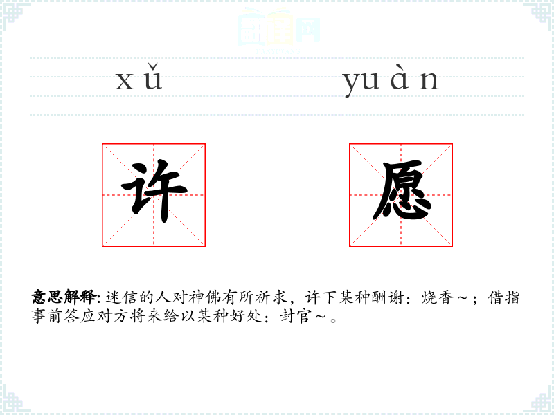 迷信的人对神佛有所祈求,许下某种酬谢:烧香~;借指事前答应对方将来给以某种好处:封官~。