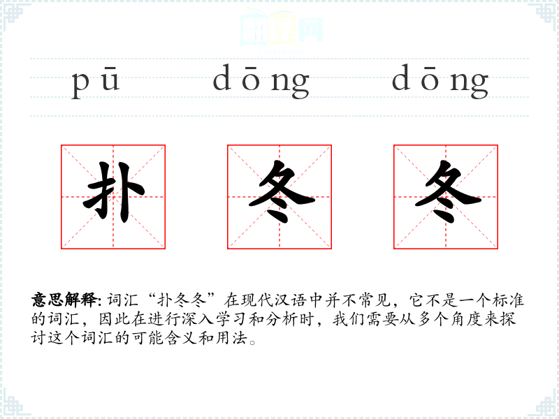词汇“扑冬冬”在现代汉语中并不常见,它不是一个标准的词汇,因此在进行深入学习和分析时,我们需要从多个角度来探讨这个词汇的可能含义和用法。