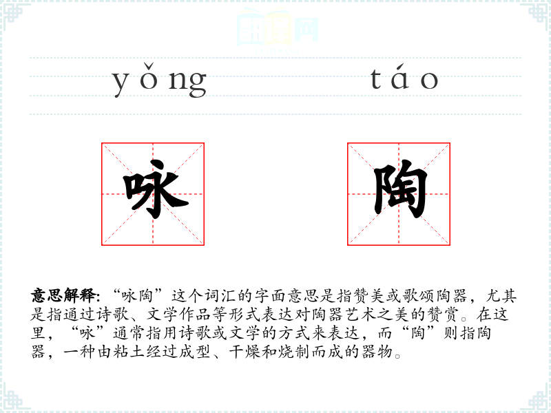 “咏陶”这个词汇的字面意思是指赞美或歌颂陶器,尤其是指通过诗歌、文学作品等形式表达对陶器艺术之美的赞赏。在这里,“咏”通常指用诗歌或文学的方式来表达,而“陶”则指陶器,一种由粘土经过成型、干燥和烧制而成的器物。