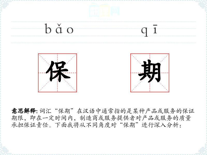 词汇“保期”在汉语中通常指的是某种产品或服务的保证期限,即在一定时间内,制造商或服务提供者对产品或服务的质量承担保证责任。下面我将从不同角度对“保期”进行深入分析: