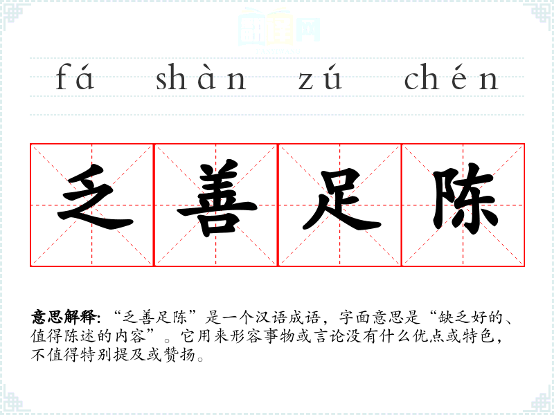 “乏善足陈”是一个汉语成语,字面意思是“缺乏好的、值得陈述的内容”。它用来形容事物或言论没有什么优点或特色,不值得特别提及或赞扬。