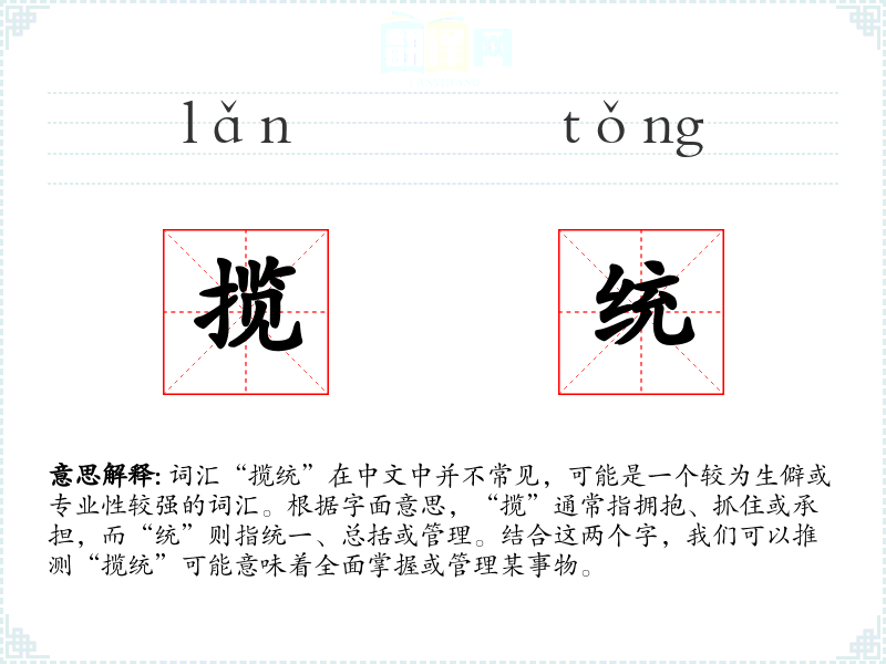 词汇“揽统”在中文中并不常见,可能是一个较为生僻或专业性较强的词汇。根据字面意思,“揽”通常指拥抱、抓住或承担,而“统”则指统一、总括或管理。结合这两个字,我们可以推测“揽统”可能意味着全面掌握或管理某事物。