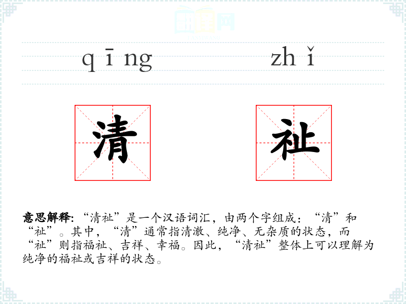 “清祉”是一个汉语词汇,由两个字组成:“清”和“祉”。其中,“清”通常指清澈、纯净、无杂质的状态,而“祉”则指福祉、吉祥、幸福。因此,“清祉”整体上可以理解为纯净的福祉或吉祥的状态。